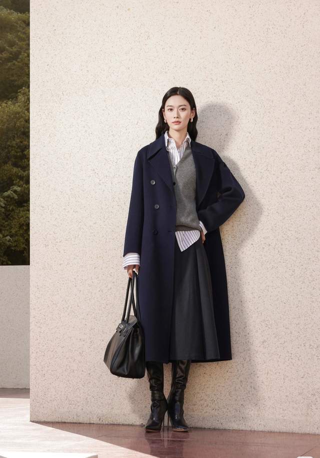 念念让我方的穿搭比拟有女东说念主味,这本领推选你遴聘请藏蓝色的翻领大衣内搭一件灰色的真挚开衫,叠穿条纹衬衫,下半身是一条灰色的伞状半身裙,脚穿细高跟的总统靴就够了,这么的造型头绪感分明,优雅又多礼,不论你穿去上班,逛街,冒失是外出旅游拍照,王人很出片。
