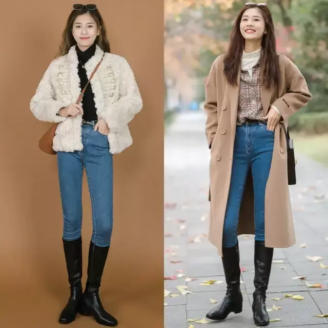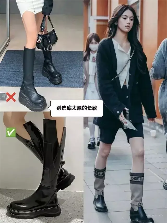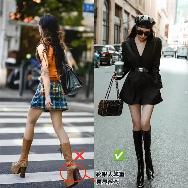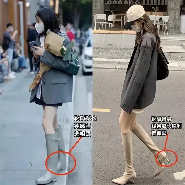 淌若你领有修长平直的大长腿,小腿肚也很平直,靴子不错遴聘修身的花样,呈现出来的线条感会比拟尖锐,那么你就遴聘细跟的靴子。