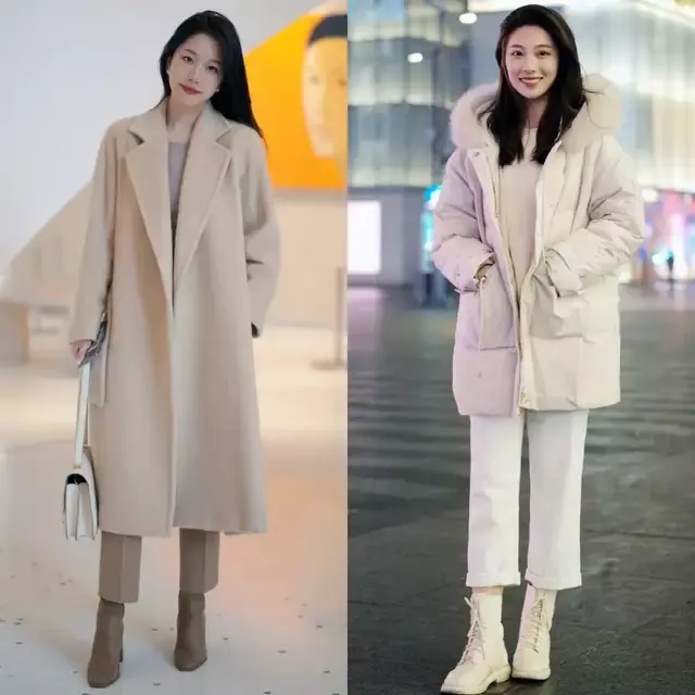 上图中的素东说念主博主,遴聘一件翻领大衣,内搭真挚毛衣,加上一条九分的西装裤脚,穿一对短靴,冒失是白色的羽绒服搭配九分裤和一对马丁靴,这么的穿搭既御寒又前卫。